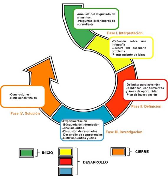 La secuencia didáctica se implementó en un grupo de 25 estudiantes, 10 mujeres y 15 hombres, quienes cursaron la asignatura de Química II del segundo semestre, del Plan de Estudios del Colegio de Ciencias y Humanidades, plantel Sur de la Universidad Nacional Autónoma de México. El alumnado fue dividido en 5 grupos de trabajo considerando la equidad de género. La implementación se desarrolló en 3 sesiones, dos de ellas de 120 minutos cada una y una tercera de 60 minutos. La secuencia didáctica se dividió en tres momentos de aprendizaje: inicio, desarrollo y cierre. En la fase de inicio se plantearon diferentes preguntas detonadoras de aprendizaje, en las fases de desarrollo y de cierre se siguieron las fases del ABP, considerando el esquema del pedagogo australiano J. David Boud (1993) (Figura 1).